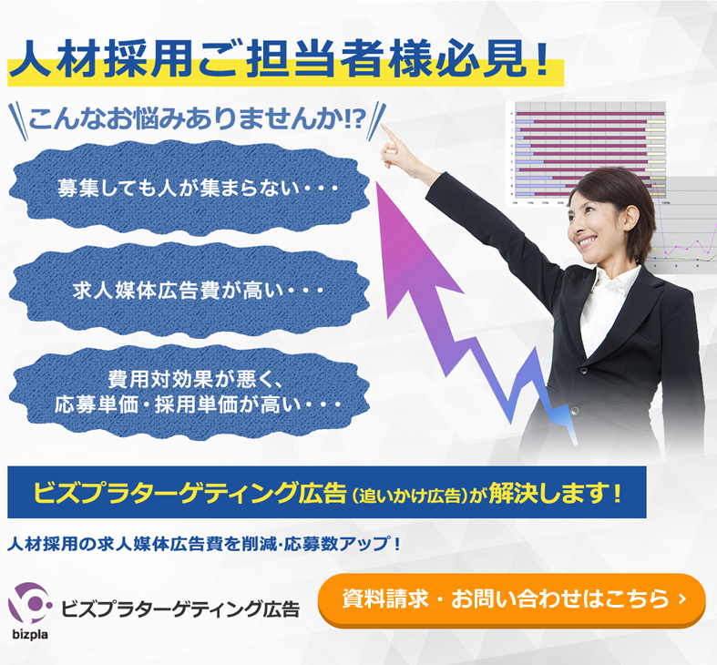 また、ビズプラターゲティング広告は、不特定多数のユーザーに広告を一律に表示する方法と比べて、狙った対象にだけ広告を表示するので、応募数が増加して採用単価が下がるなど、広告の費用対効果が高くなる傾向があります。